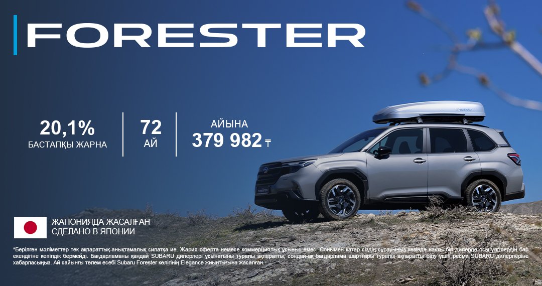 Бағдарламаны қандай SUBARU дилерлері ұсынатыны туралы ақпаратты, сондай-ақ бағдарлама шарттары туралы ақпаратты білу үшін ресми SUBARU дилерлеріне хабарласыңыз. Ай сайынғы төлем есебі Subaru Forester көлігінің Elegance жиынтығына жасалған.